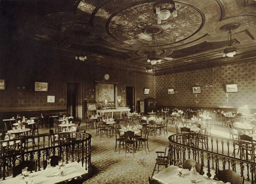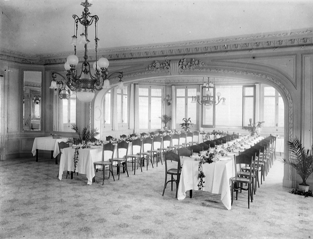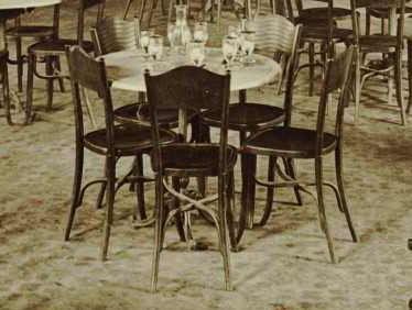 La cuestión es que la propaganda de Albacar le fue muy útil cuando se instaló en Barcelona, creemos que en 1907, en la calle de Balmes núm. 10, a un tiro de piedra, en sentido figurado, de la tienda de Hermanos Thonet en el número 40 de la calle Pelayo. Las sillas de Albacar eran más baratas -alrededor de un tercio del precio- que las de los fabricantes vieneses y obviamente tuvieron mucho éxito precisamente en casinos y hoteles, que necesitaban piezas en cantidades considerables. En la década de 1910 fue popular, en particular, un modelo de silla con la traba patentada núm. 2. Sin ningún ánimo exhaustivo -seguramente en el Hotel Regina en la calle Vergara de Barcelona también las tenía- aquí recogemos imágenes de los siguientes establecimientos públicos que disponían de sillas de Albacar con esta traba, en ocasiones en un número importante de unidades. Era una silla sencilla, sin continuidad lineal de patas traseras, con una pala del respaldo decorada con diversos motivos y asiento de chapa rectangular en vez del típico asiento redondo con rejilla.