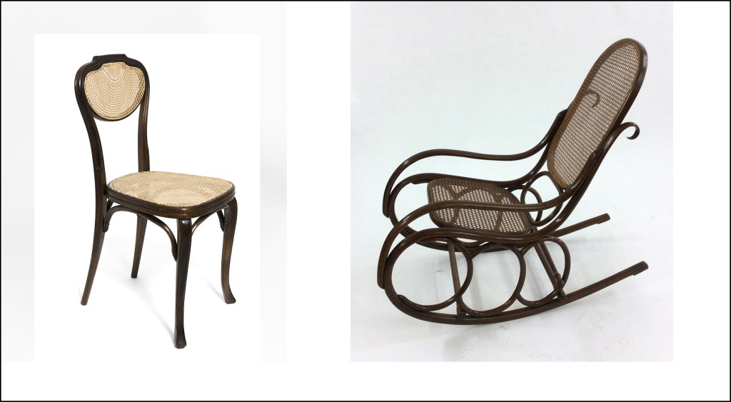 Este ejemplar de silla es sin duda uno producido por Kohn que la comercializaba preferentemente en el mercado Estadounidense (con la numeración de 303o 301 A). Su estilo es historicista por sus patas delanteras estilo inglés y la rejilla del respaldo en forma de abanico o de concha. O una silla Art nouveau barroca, según se mire. Las patas traseras y el respaldo, a pesar de su irregularidad, están curvadas de una sola pieza lo que era un procedimiento patentado. Uno de los lugares emblemáticos del París de 1900 tenía este modelo en su comedor Art Nouveau: el Hotel Regina (como curiosidad las sillas continúan usándose en el siglo XXI con tapicería en algunas habitaciones del hotel). El respaldo en forma de abanico de la rejilla en este ejemplar ha sido reconstruido de conformidad con el diseño original por la especialista Mariona Velasco, con taller en Barcelona.