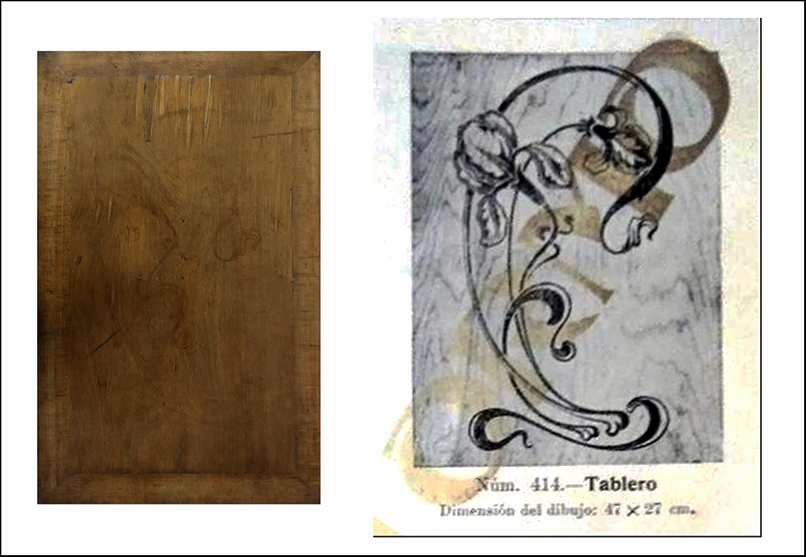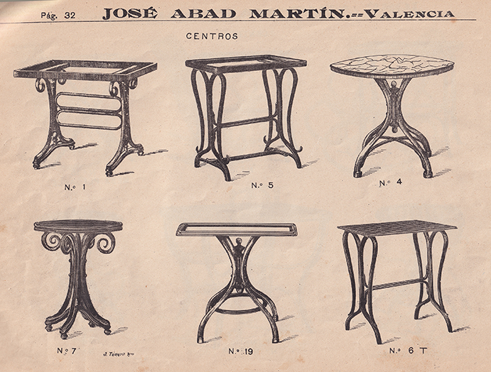 Quizá uno de los modelos propios, que no hemos visto en otros catálogos, es una curiosa mesa pequeña de madera curvada que es más bien una mesa de servicio o de lectura. Aparece entre las mesas del catálogo de este fabricante y también en el catálogo de muebles de los Almacenes «El siglo» de Barcelona de 1913.