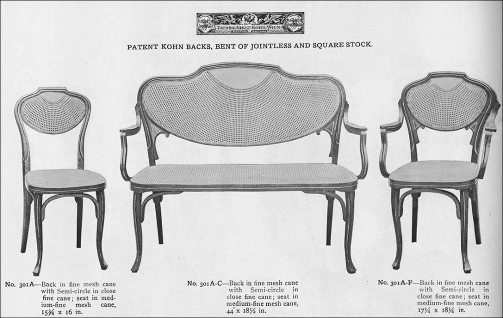 Una de las características de los catálogos de mueble de Viena de la primera década del siglo XX era la cantidad de variaciones sobre un mismo tema (modelo) de silla que se ofrecían a la clientela. En 1900 Jacob & Josef Kohn ofreció en su catálogo un modelo con el respaldo en forma de concha -número 300- y a continuación aparecieron variantes con rejilla ordinaria, tapizados diversos, rejilla en forma de abanico, patas estilo Reina Ana -muy populares en los Estados Unidos- con el asiento rectangular…etc. Posiblemente esta silla era un diseño de Gustav Siegel, arquitecto recién incorporado al departamento de diseño de la empresa. En el catálogo para los Estados Unidos de 1911-1912 aparecen cuatro páginas con variaciones de este modelo de inspiración Rococó. La numeración es variable para poder distinguir qué modelo se demanda exactamente: 301 a, 302, 303, 303-1, 303 a… La característica común de todos ellos en versión de silla o sillón es la construcción del respaldo y las patas traseras en sección rectangular y acanalada en una sola pieza continua, lo que viene indicado en el catálogo para los Estados Unidos y Canadá de 1909 como una patente: «bent of jointless and square stock».