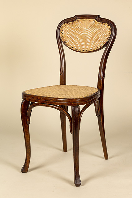 El modelo más llamativo de la serie a nuestro parecer, es el que tiene la rejilla del respaldo en forma de abanico redondeando el diseño «rocaille» de la silla. Sobre esta silla hicimos una entrada basada en el modelo del Hotel Regina de París que se dotó de ellas en su restaurante Art nouveau en 1900 [https://muebledeviena.com/2019/02/06/restaurando-una-silla-hotel-regina-de-paris/]. Se observa perfectamente que la rejilla del respaldo tiene forma de abanico. Como señalamos en su día, en el hotel todavía se usan actualmente estas sillas en algunas de las habitaciones, ahora tapizadas.