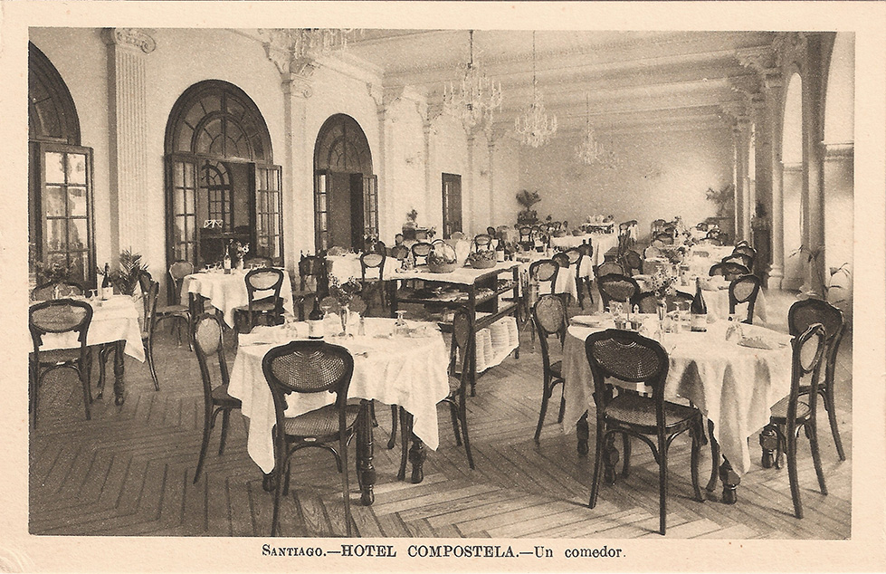 Finalmente, una silla con respaldo en forma de vieira no podía faltar en el flamante Hotel Compostela de la capital del camino de Santiago, que precisamente se simboliza con una concha de vieira. El edificio se inauguró en 1929 y era obra del arquitecto vigués Antonio de Cominges (1897-1987) siendo el primer gran Hotel de Santiago. Las sillas «vieira» del comedor del Hotel Compostela tienen la particularidad de que la pieza del respaldo que incorpora el abanico de rejilla tiene unas piezas de refuerzo en su parte inferior, como es el caso del sillón del mismo modelo. Como sillas de un comedor en el corazón de Galicia no se nos ocurre una simbología más evocadora de la función.
