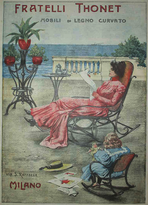Y lógicamente en los catálogos se ofrecía con complementos. En algunos casos, como en el catálogo de 1899, se presenta con la posibilidad de adjuntar un reposa-pies extensible -para mejorar la comodidad del asiento que entonces se asemeja a una chaise-longue– o un apoya-pies que permite reforzar la función de balanceo. Estos mecanismos útiles eran opcionales y podían instalarse en varios tipos de mecedoras. Hay una conocida publicidad de la tienda de Thonet de Milán publicada a toda página en el número 48 (3 de diciembre) de la Domenica del Corriere de ese mismo año 1899 donde la mujer lectora se apoya cómodamente en un reposa-piés extensible.