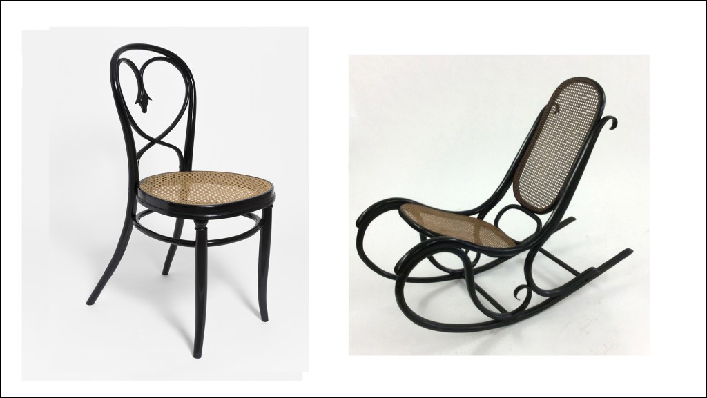 El Museo Nacional de Artes Decorativas, con sede en Madrid, tiene una nutrida colección de sillas y mecedoras vienesas. En esta ocasión veremos dos piezas en negro, muy típicas del fabricante «Hijos de D. G. Fischel».