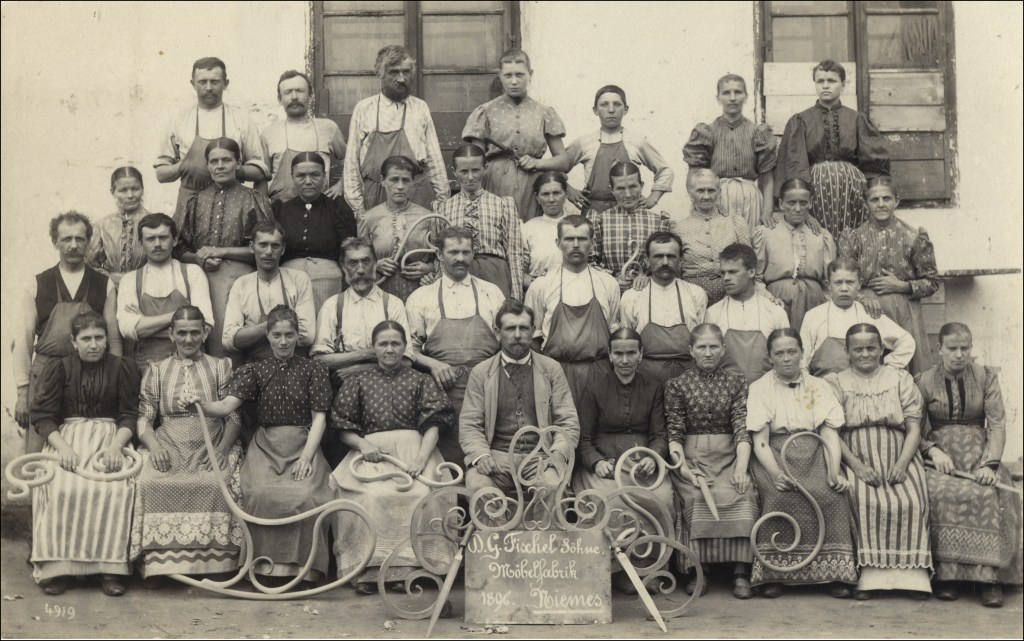 La pequeña y elegante mecedora sin brazos -para mejorar su accesibilidad- es un diseño de Hermanos Thonet desde 1867. En algunos catálogos se indica que es una mecedora «para señoritas». El ejemplar del MNAD es algo diferente del de Thonet, en particular por el grueso de la barra de madera -mayor en Fischel- y la posición de la barra estabilizadora. En cualquier caso, es un modelo adaptado particularmente a las necesidades de las usuarias. Fischel también tenía un modelo con el mismo diseño, pero con apoya-brazos descrito en el catálogo con el número 6. En un precioso álbum de fotografías de 1896, que retrata a los trabajadores de la fábrica, puede verse a una mujer, probablemente de la sección de lijadoras, sosteniendo un lateral de una mecedora nº 5.