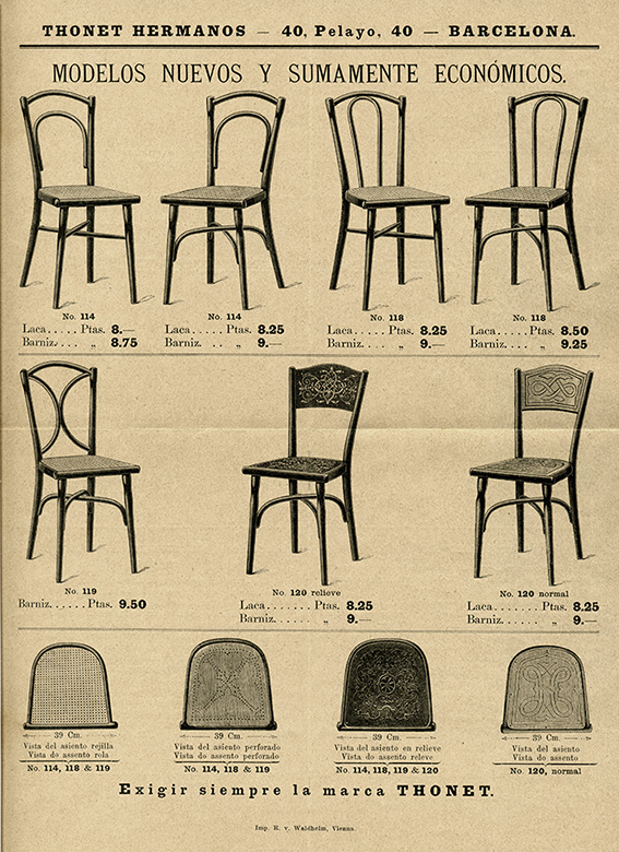 En Cataluña estos modelos de silla nº 114 y 118 «sumamente económicos», en las palabras del catálogo de 1891, se encontraban en el comedor del modernista Hotel Bofill de Viladrau.