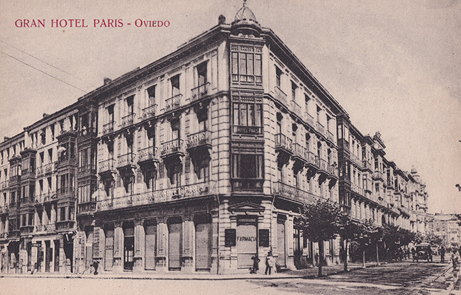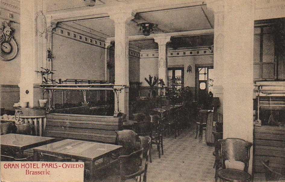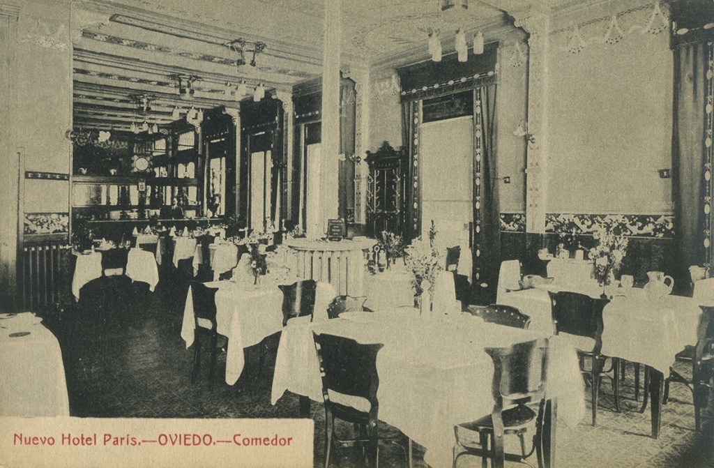 El Hotel estaba en la calle Uría n. 14, frente al Paseo de los Álamos. El edificio, reformado, todavía está en pie. Desde finales del siglo XIX, al menos desde 1898, el lujoso Hotel se llamaba «Gran Hotel de París» -propietario Bernardo Ferrer- hasta que en 1910 lo adquirió un nuevo propietario, Manuel del Valle Diaz, y paso a llamarse «Nuevo Hotel París», inaugurado en 1911. Cerró en 1928. Existen diversas informaciones periodísticas como en «Nuevo Mundo» de 1913 sobre el nuevo Hotel y puede verse parcialmente en una película de 1922 [https://www.facebook.com/watch/?v=259454312250768]. Las tarjetas postales que se conocen se pueden dividir en dos grupos: las del «Gran Hotel de París» y las del «Nuevo Hotel París». Pero las sillas del comedor y de la brasserie (cervecería) del Hotel eran las mismas antes y después de la reforma como puede apreciarse en dichas postales. Sobre los comedores de hoteles y fondas en Asturias en el período de entre siglos puede consultarse en línea el artículo de Gracia Suárez Botas [https://doi.org/10.17811/rm.4.2015.95-109].