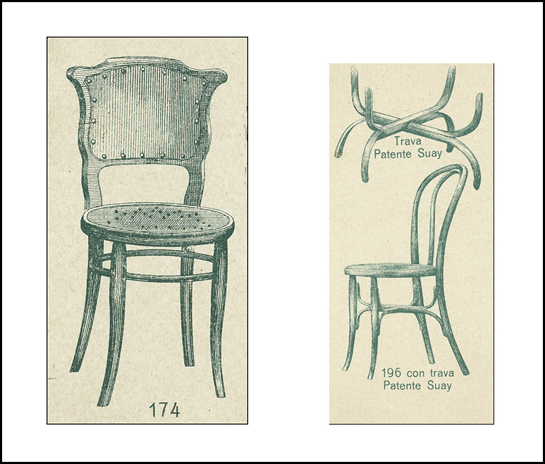 Otro fabricante de Valencia, Luis Suay, siguiendo el mismo esquema formal de Trobat, añadió una chapa en el respaldo para mejorar la comodidad de la silla y asi aparece en su catálogo de 1910 (ca.). Opcionalmente la silla podía llevar la llamada «traba Suay», patentada en 1902 en España, un refuerzo entre las patas muy característico en forma de cruz bifurcada. Pues bien las sillas del comedor y de la cervecería del Hotel París, el de antes y el de después de la reforma, son este modelo de Suay con la traba, como se aprecia perfectamente con una ampliación de la tarjeta postal, en este caso de «Nuevo Hotel París». Las sillas debían estar en buen estado y el nuevo propietario decidió conservarlas.