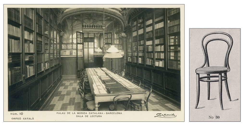 Fig. 1. Sala de lectura del Palau de la Música Catalana. Postal sobre fotografia de Zerkowitz (1930 ca.). Dreta: cadira núm. 30 de Jacob & Josef Kohn: il·lustració de catàleg. Arxiu de l’autor.
