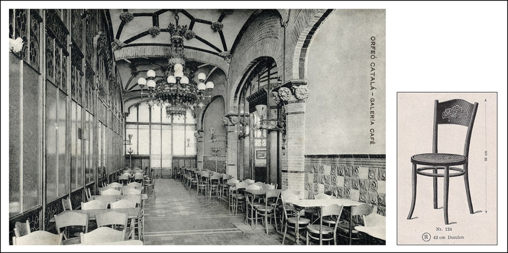 Fig. 2. Postal de la Galería-Cafè del Palau de la Música Catalana. Dreta: cadira núm. 124 de Germans Thonet: il·lustració de catàleg. Arxiu de l’autor.