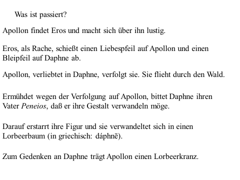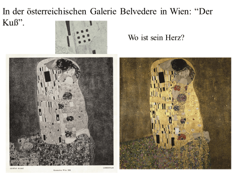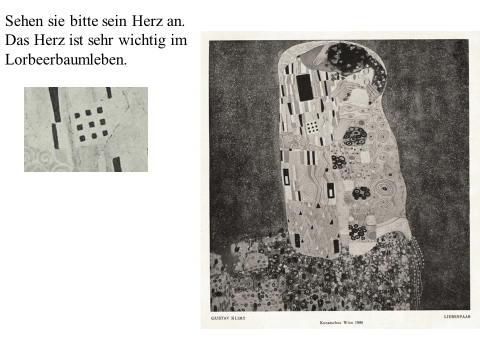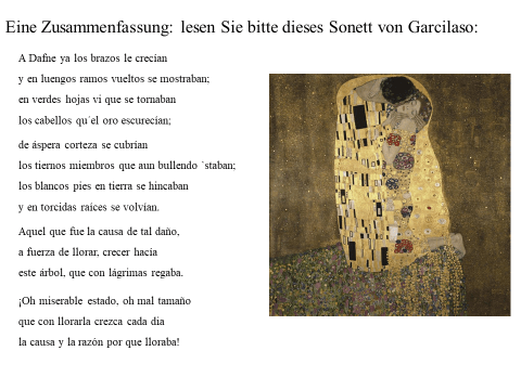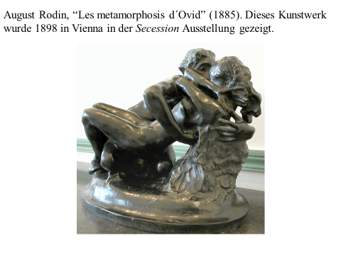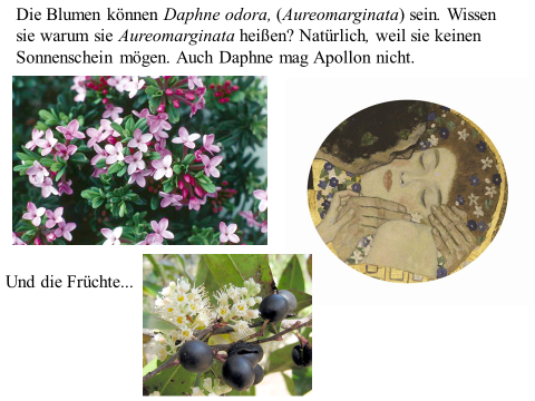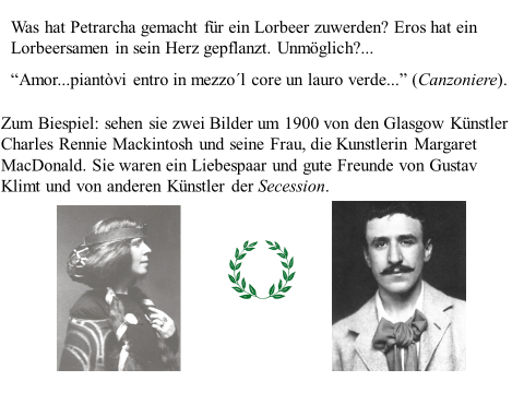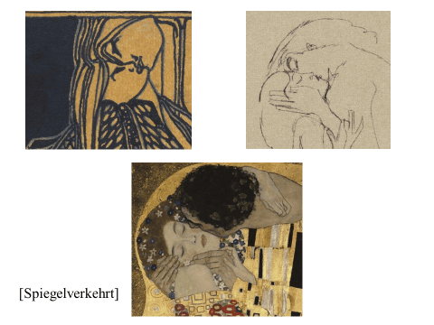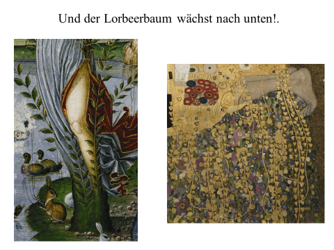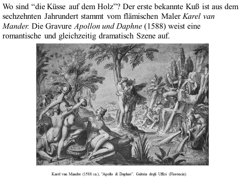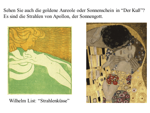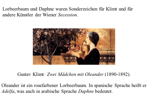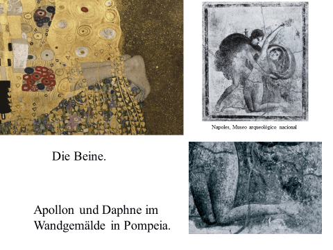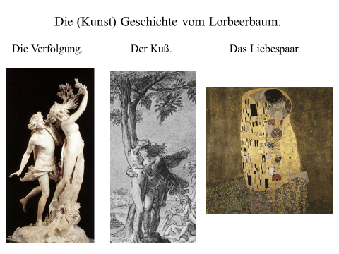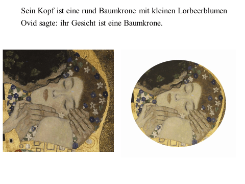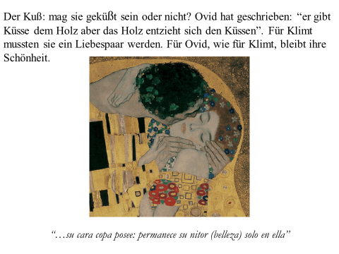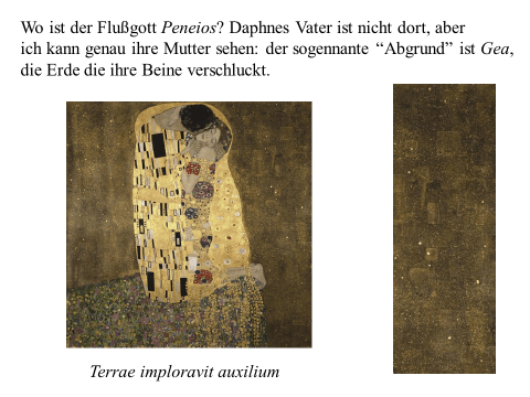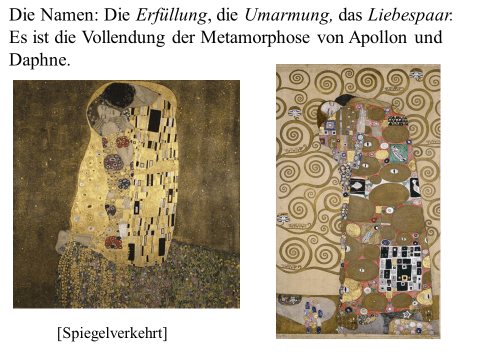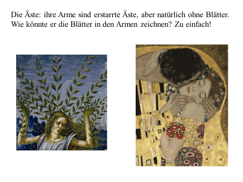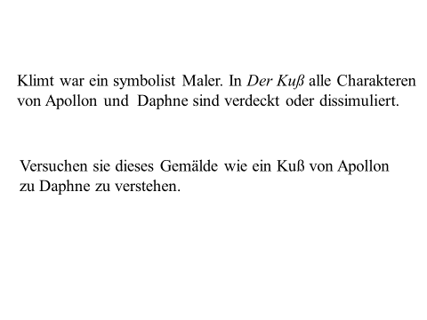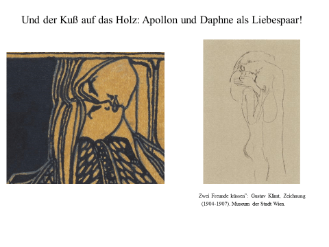 Nachfolgend präsentiere ich ein recht einfaches PDF mit meiner ikonographise Interpretation des Werks «Der Kuss (Liebespaar)“ von Gustav Klimt. Das Wesentliche an dieser Interpretation ist, dass das Werk den ovidischen Moment widerspiegelt, in dem Apollo die Nymphe Daphne küsst, als sie sich in einen Lorbeerbaum verwandelt. Zwischen Literatur und Kunst besteht eine enge Verbindung. Text ist überwiegend auf Deutsch (ich hoffe, es gibt nicht Fehler), die Bilder bedürfen jedoch keiner Übersetzung. Meine Interpretation ist vielleicht nicht wissenschaftlich (?). Hat «Der Kuss» nicht seinen Platz in der Kunstgeschichte gefunden? Ich hoffe aber, dass Sie Interesse haben. Vielleicht ermutigt es andere, weiter zu studieren. Zumindest hoffe ich, dass du Spaß hast. Wenn Sie Anmerkungen, Kritik oder Bitten um Klarstellungen haben, können Sie den Kontaktlink nutzen. Sie können mich auf Deutsch ansprechen. Ich verwende Google Translate.
