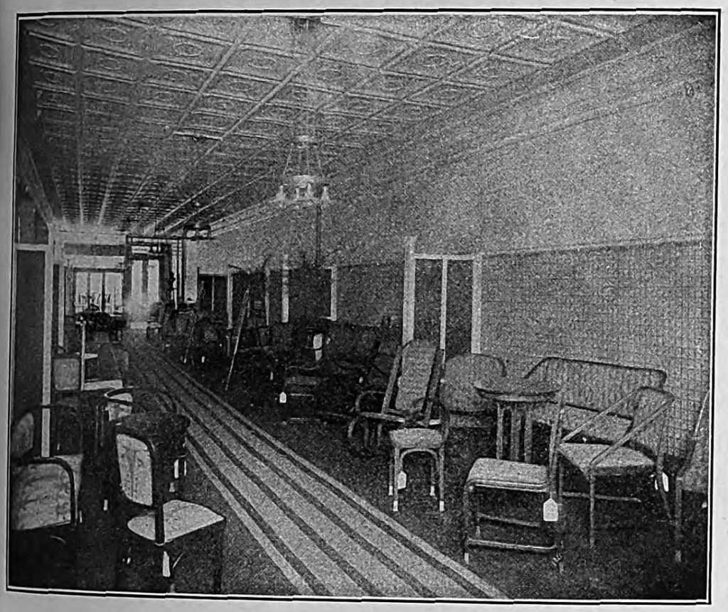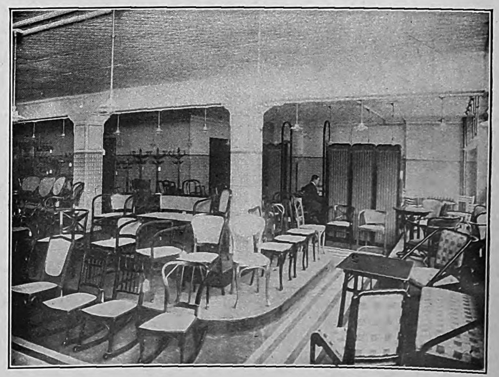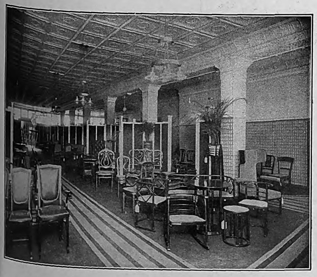Por fortuna hemos encontrado un volumen de la revista The Furniture Journal (vol. 27, 1907) en la que se reproducen seis vistas del interior del depósito de Chicago que vale la pena reproducir, teniendo en cuenta la escasez de imágenes de interior de las tiendas de Kohn, salvando las de Berlín y París que ya hemos visto en este blog. En las imágenes se aprecia gran cantidad de mobiliario con una variedad de modelos, destacando el contraste entre el mueble moderno y el mueble de madera curvada clásico.