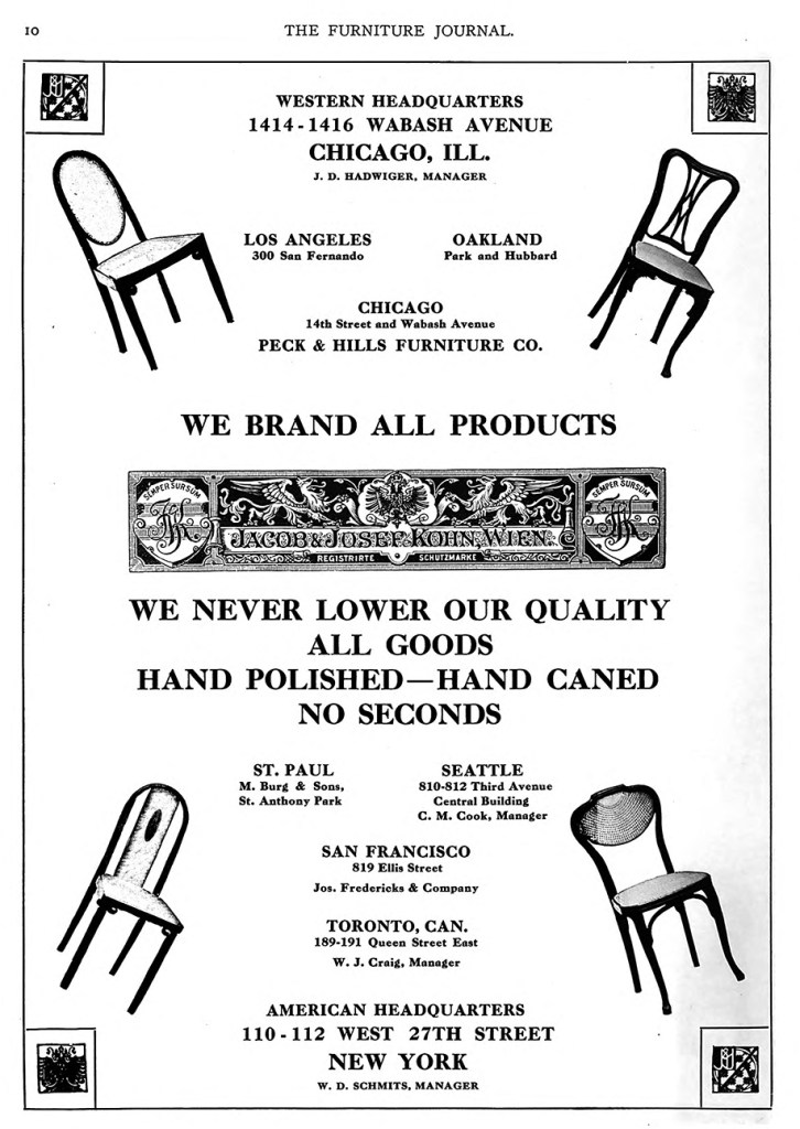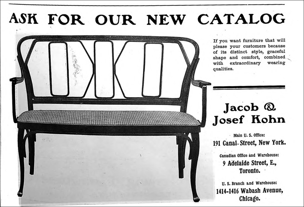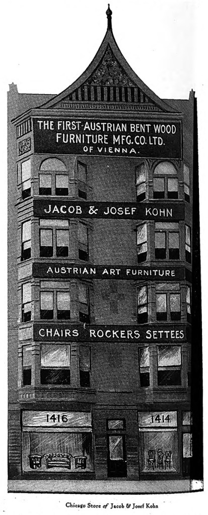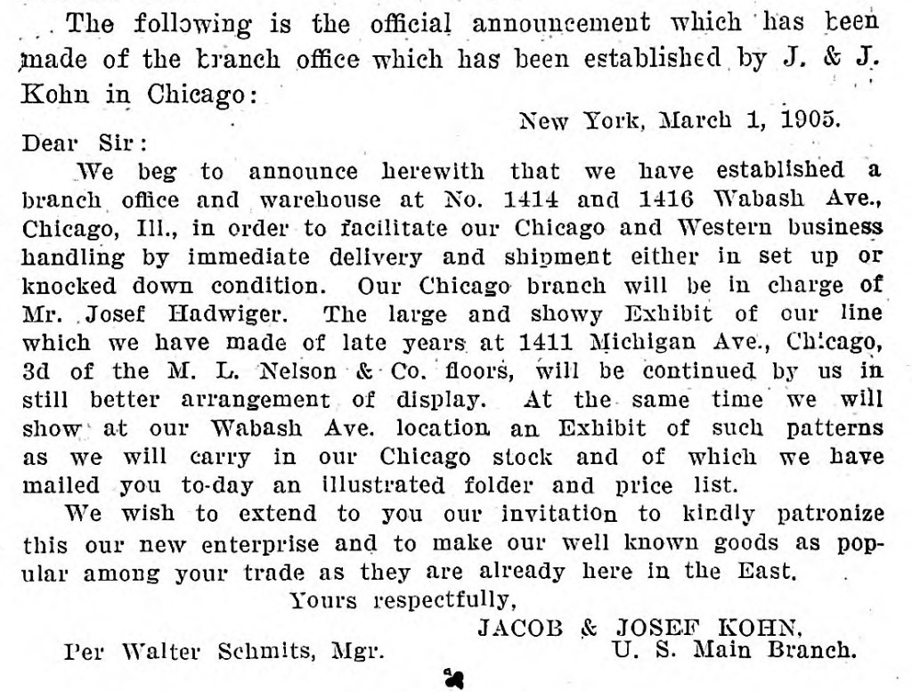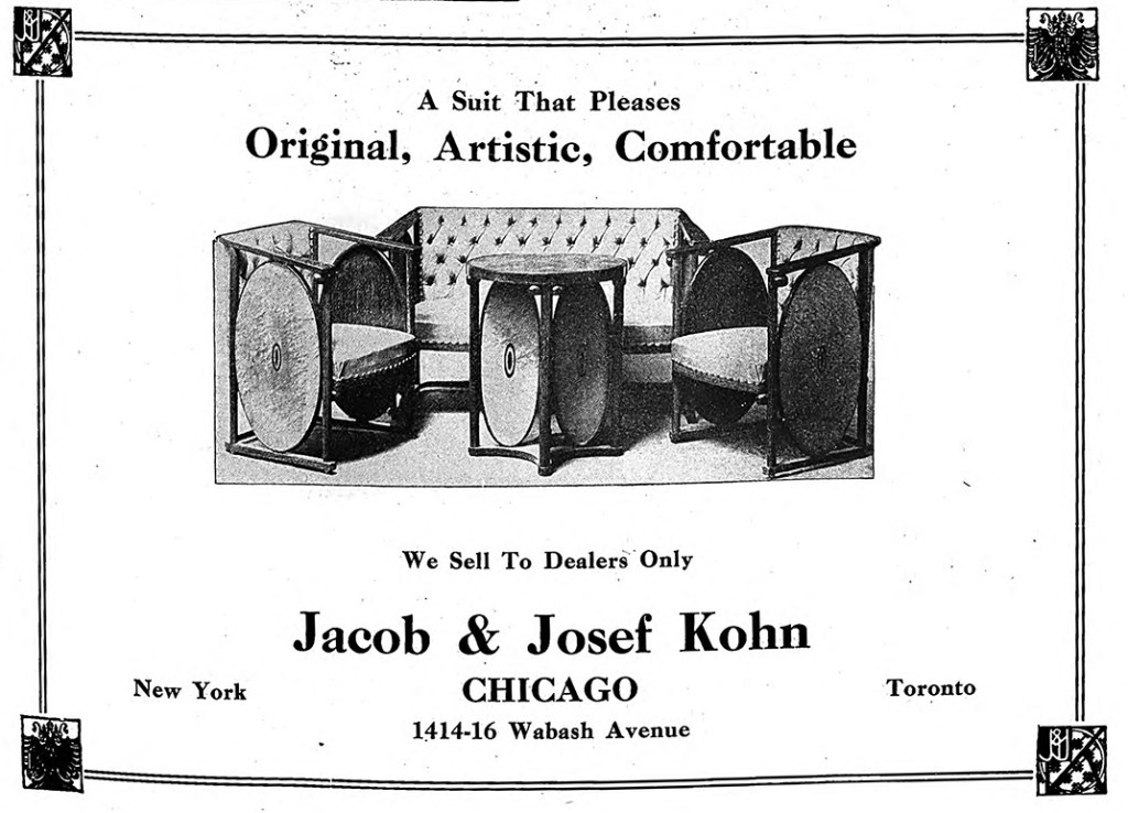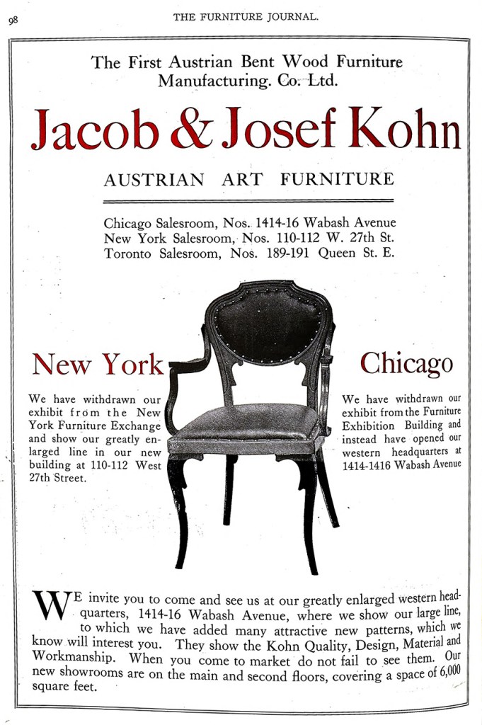 A raíz de esta Exposición de 1904 Kohn actualizó su depósito en Nueva York (pasó a 110-112 West 27 th. Street) y estableció uno nuevo en Chicago, donde hasta entonces presentaba sus muebles en el Furniture Exhibition Building, 1411 Michigan Avenue. El nuevo depósito se estableció en 1906 en un edificio de la Wabash Avenue (nos. 1414-1416) que en 1916 se transformó en South Wabash Avenue nos. 1410-1418. No sabemos si el edificio todavía existe. Diversas informaciones de aquellos años de la revista editada en Chicago, The Furniture Journal nos dan cuenta de la ejemplaridad de la Warehouse de Kohn -se presentaba como proveedor de Austrian Art Furniture– en el contexto de un distrito de la ciudad importante para el comercio de mobiliario.