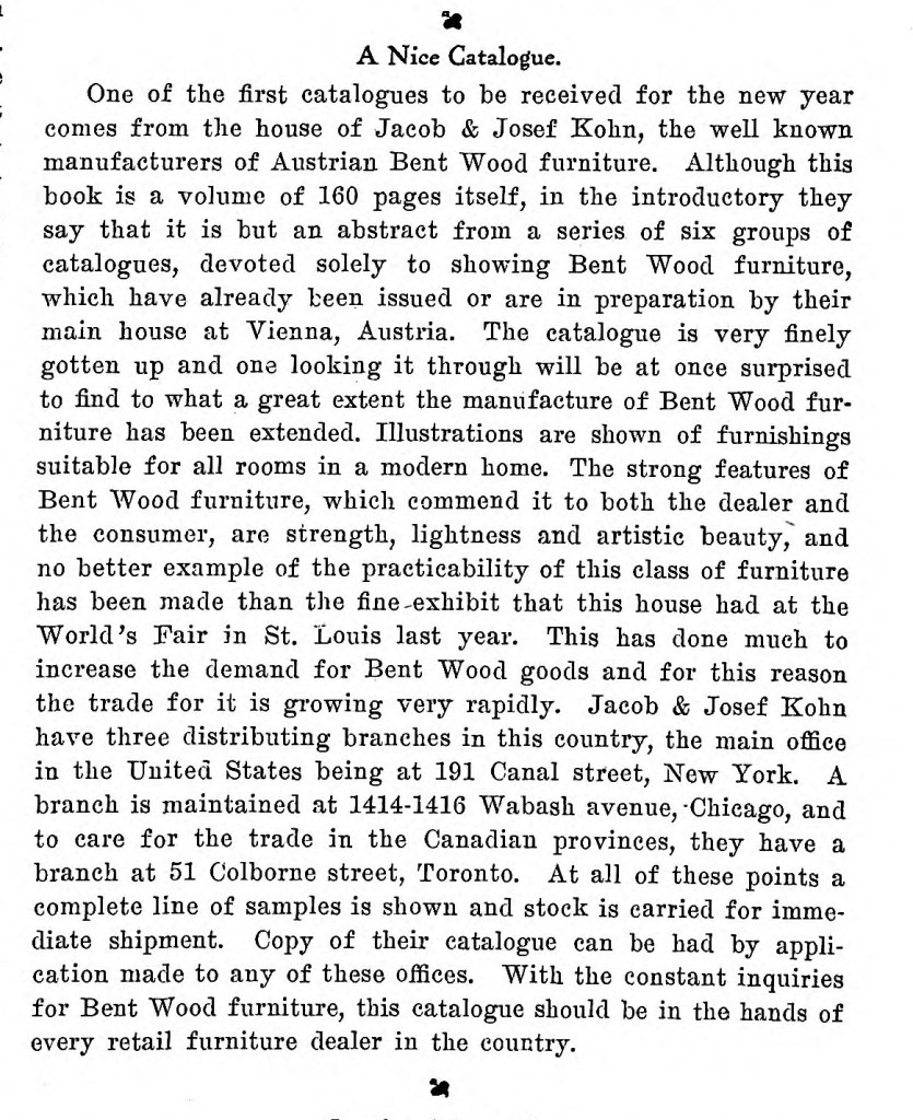 La actividad de Kohn en el contexto de la mencionada revista se extendía también a los anuncios, encontrándose diversos ejemplos de los que traemos aquí a colación una selección. En el último de ellos se hace alusión a la posibilidad de pedir una copia del catálogo de 1906, documento de 160 páginas que no hemos encontrado en su versión para los Estados Unidos dado que los catálogos de aquella época y país conocidos de Kohn son de 1909 y de 1911-1912, este último accesible en línea [https://muebledeviena.com/2022/10/31/comentarios-al-catalogo-de-jacob-josef-kohn-para-los-estados-unidos-y-canada-de-1911-1912-accesible-en-linea-en-la-cooper-hewitt-smithsonian-design-library/]. Reproducimos también un interesante comentario de la mencionada revista sobre la edición del nuevo catálogo.