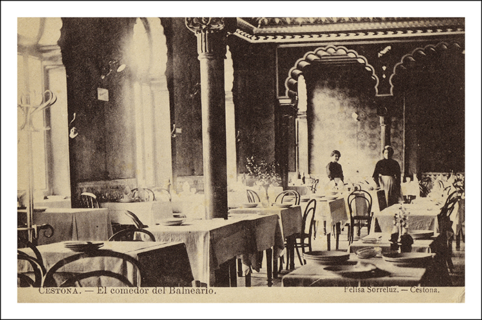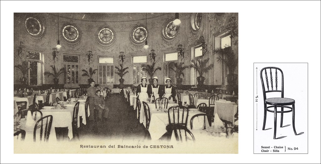 Situado en la localidad de Cestona/Zestoa, fue el primer balneario del País Vasco desde el siglo XVIII y todavía existe. El Gran Hotel data de 1893. En sus instalaciones se encontraban modelos variados de mueble de Viena, -sillas nº 14 y 18, modelos de Thonet, por ejemplo- destacando en el comedor llamado “salón árabe” la silla nº 94 de Hijos de D. G. Fischel, con tres barras torneadas en el respaldo. El modelo nº 94 apareció por primera vez en el catálogo de Fischel de 1889, p. 20 (archivo del autor) y estuvo en producción al menos hasta 1915. [Vid. SIMONÍKOVÁ, Jaromíra, D. G. Fischel Sons. The 1915 catalogue, München: Ketterer Kunst Verlag, 1992, anexo, p. 23]. Los respaldos torneados fueron una característica destacada del mobiliario de Fischel. Este estilo, de raigambre historicista, tuvo mucha repercusión en la producción de Valencia a partir del 1900.