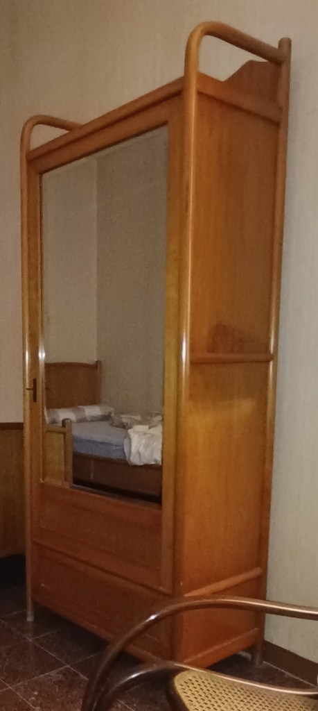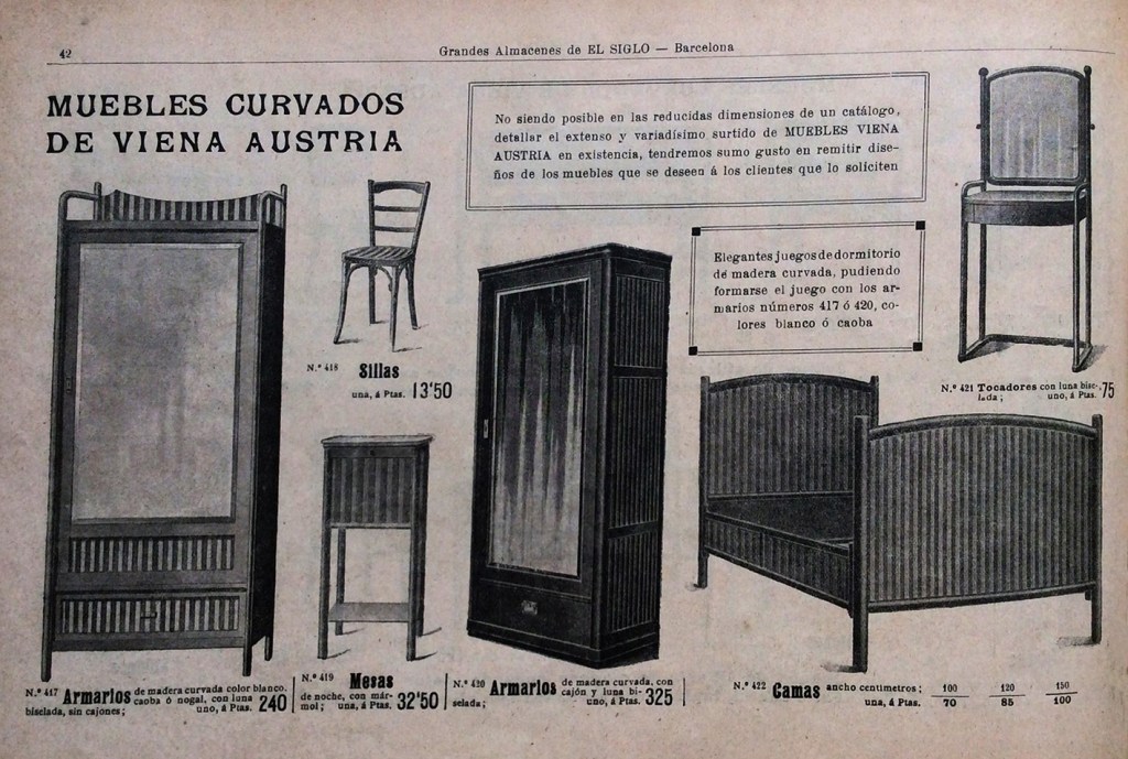 Eran, casi todos, muebles de Jacob & Josef Kohn que se vendían en la primera década del 1900 en la moderna tienda del fabricante de Moravia en el nº 21 de la Plaza de Catalunya. Cuando tuvo que cerrar la tienda, en 1912, porque el edificio lo adquirió un banco, se vendieron durante un tiempo muebles de Kohn en los Grandes Almacenes «El Siglo». Creemos que el dormitorio de Vilassar de mar se compró ya sea en la tienda, ya en los mencionados grandes Almacenes por esas fechas. Es posible esta segunda opción porque algunas de las piezas del dormitorio, las camas, el armario, la mesita de noche y el tocador aparecen en una de las páginas dedicadas al mueble curvado de Viena del Catálogo de muebles de «El Siglo» de 1913 (ca.), catálogo sobre el que se puede ver una entrada en este blog.