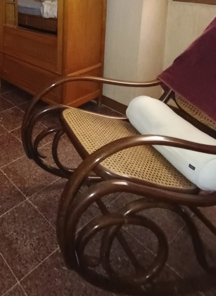 En cambio, la mecedora presente en la estancia es la nº 6 a del catálogo de Hermanos Thonet. Lleva la placa de la tienda de la calle Pelayo nº 40 y la segunda etiqueta del fabricante vienés, posterior a 1883. Es una pieza de difícil ejecución por el lazo extremo de la parte delantera de los laterales.