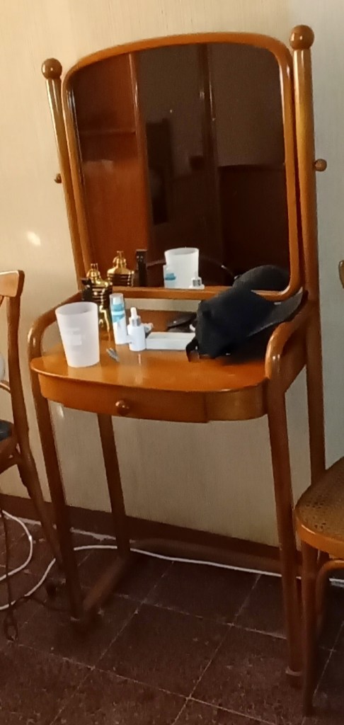 Una de las piezas destacadas del dormitorio es el tocador, cuyo diseño es generalmente atribuido al arquitecto Josef Hoffmann, que trabajaba para la casa Kohn en aquellos años. Las esferas que flanquean el espejo y la base de estructura horizontal serían argumentos a favor. En el libro del especialista Giovanni Renzi sobre «Il mobile moderno» (pp. 192-193) se indica que es un diseño de Josef Hoffmann de 1905, fabricado a partir de 1906. También puede verse en el volumen «Gebogenes Holz. Konstruktive Entwürfe Wien 1840-1910», pp. 88-89, erróneamente atribuida su ejecución a Thonet, error que extrañamente se reproduce en el libro «Against the Grain» (p. 119, item 47). Es un mueble de Kohn que se encuentra en el catálogo belga de 1906, publicado por Renzi.