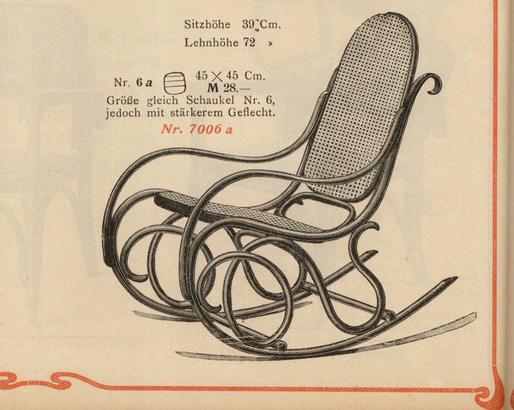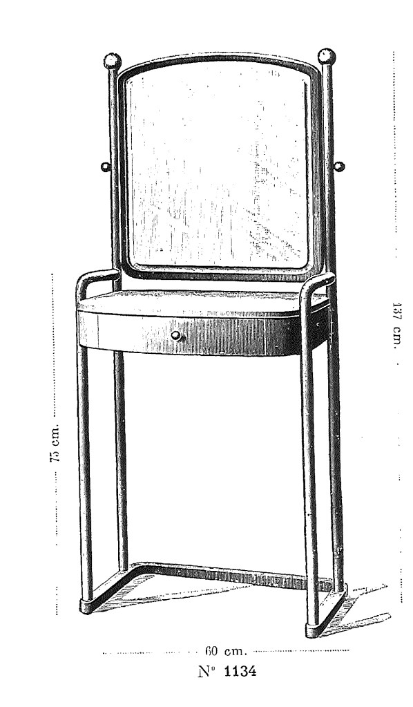 Las dos sillas que acompañan al tocador son el modelo de «hoja de palmera» nº 196 del catálogo de 1902, que señala que es un modelo registrado (Musterschutz). Debía tener algún tipo de protección legal pero el diseño, esencialmente, es muy similar al de la silla «hoja de palmera» que sacó al mercado Hermanos Thonet en 1898 y que encontramos, por ejemplo, en Barcelona, en el Restaurante del Apeadero del Paseo de Gracia hacia el año 1902, aproximadamente (véase la correspondiente entrada en este blog).