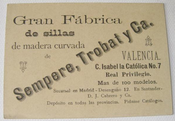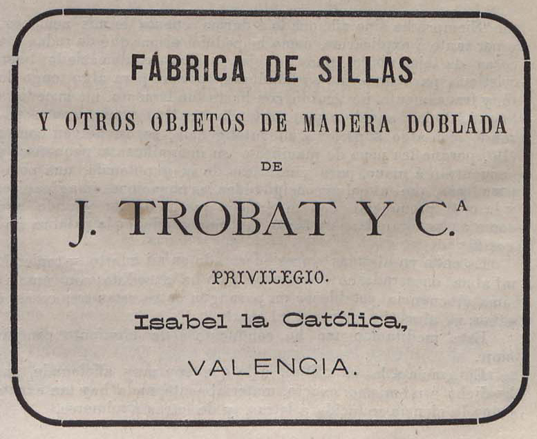 “La Exposición regional ha producido el excelente resultado de llamar la atención sobre algunas industrias nuevas en Valencia: entre ellas es quizás la principal la fábrica de muebles de madera doblada del Sr. Trobat, que apenas cuenta tres años de existencia, y compite ya con la industria extranjera.