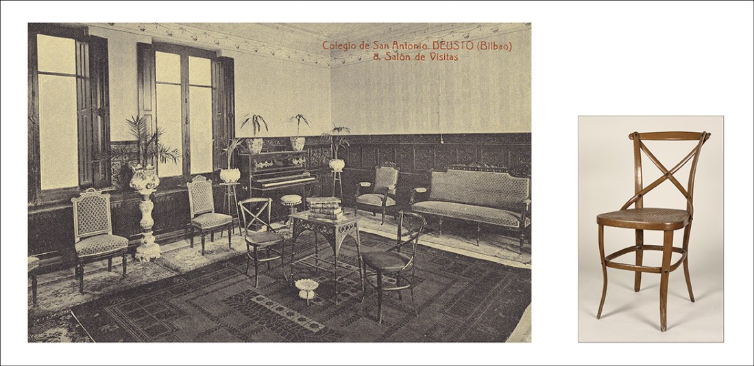 En la sala de visitas de este colegio, (Deusto, Bilbao) establecido en 1867, se encontraban dos ejemplares del modelo nº 91 de Hermanos Thonet, según se muestra en una tarjeta postal. Esta silla apareció en el catálogo de 1891 y se la llama “lattenstuhl” (en alemán), - “silla de listones”, en español-, por estar hechas … Sigue leyendo Colegio de San Antonio (Deusto): silla de listones de Hermanos Thonet.
